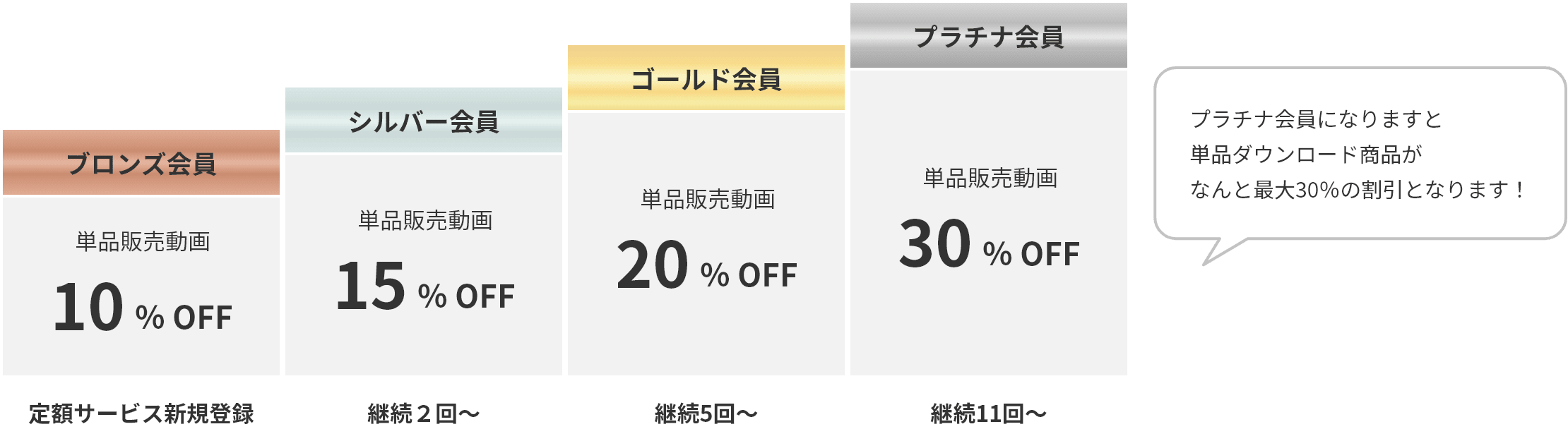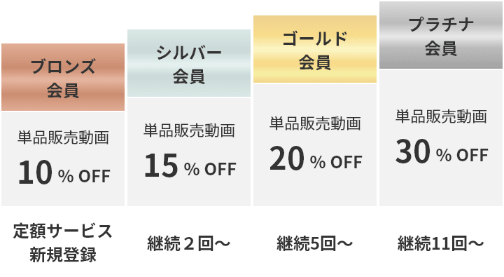 SpiceTVでは定額ダウンロードサービスの継続回数に応じて、ブロンズ、シルバー、ゴールド、プラチナの4つの会員ランクを設けております。